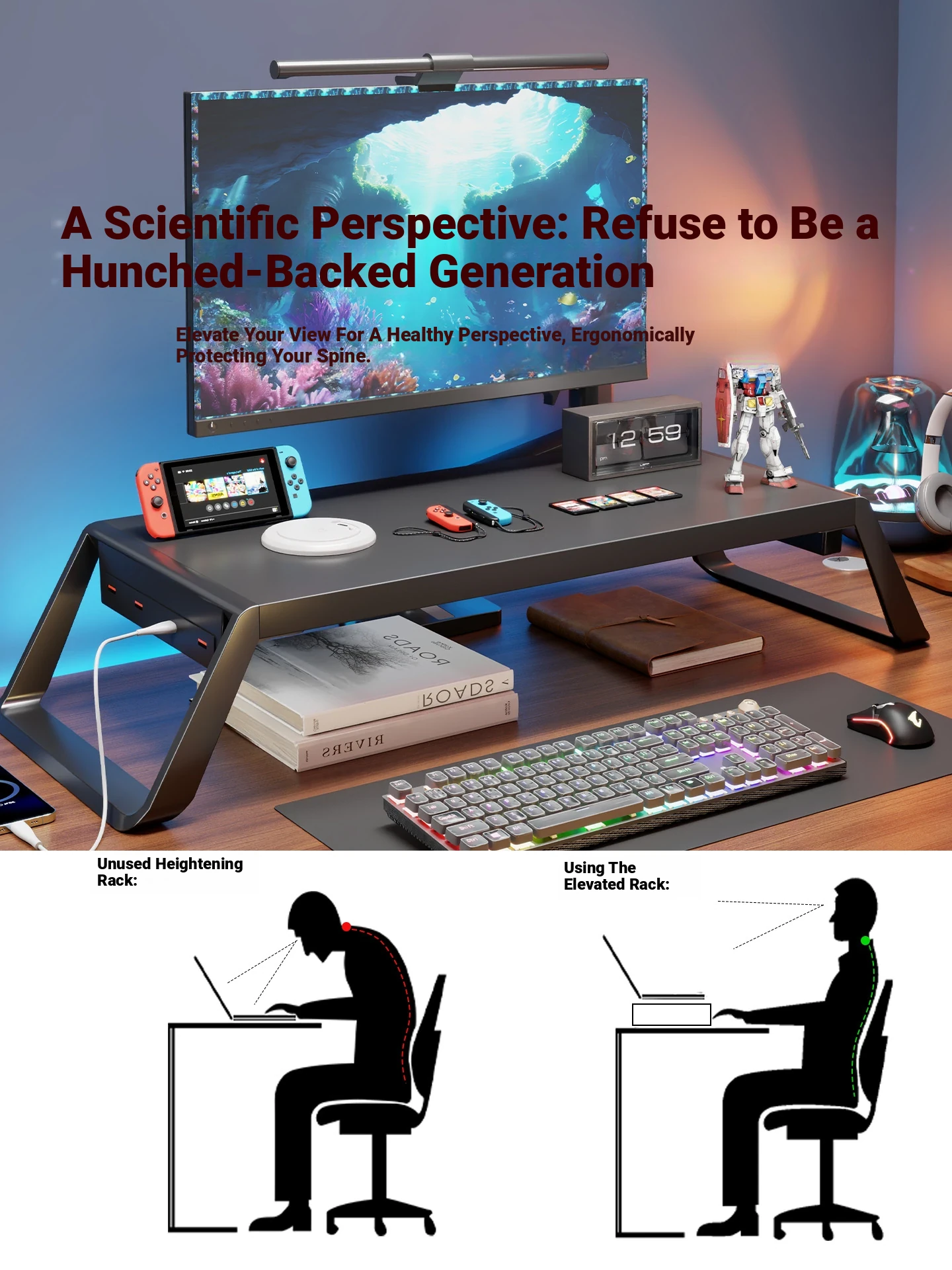 Desktop Monitor Riser with USB Ports - Adjustable Height Stand for Gaming Setup and Laptop Storage - Perfect for Organizing Your Workspace