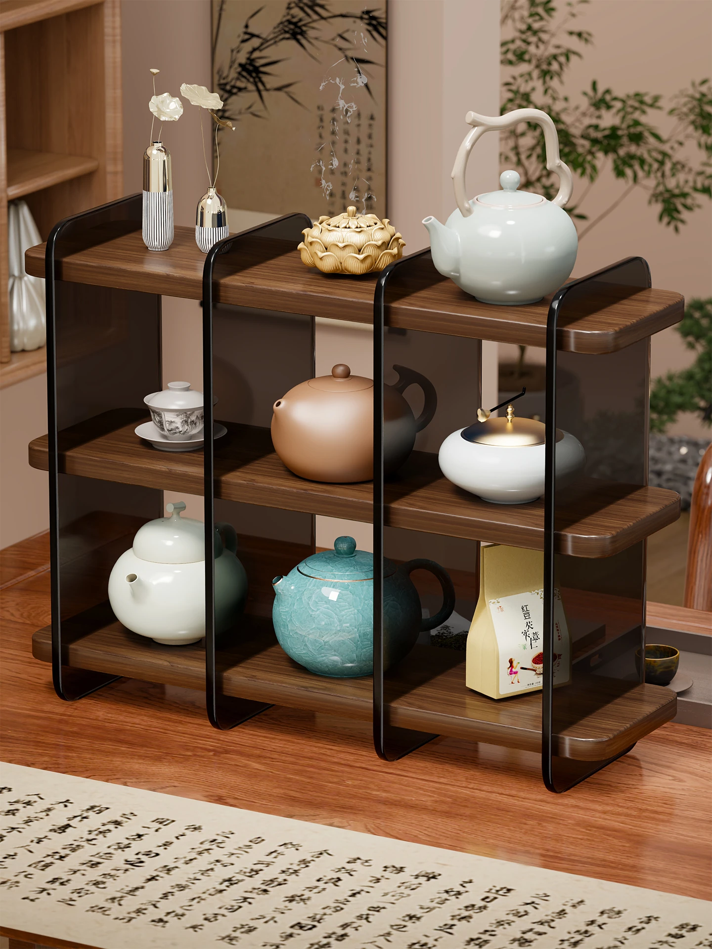 現代的シンプルな新中式デスクカップスタンド - 茶室にぴったりの小型茶具収納ディスプレイラック!おしゃれで機能的な空間を演出し、あなたのティータイムをより特別なものに。